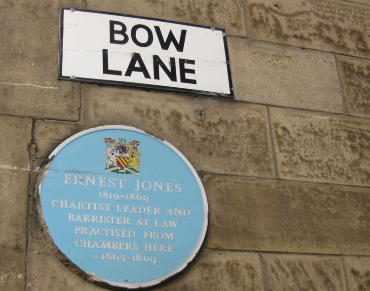 At the end of Bow Lane, where it meets Cross Street, is the site of the chambers where Ernest Jones practised law in the 1860s.